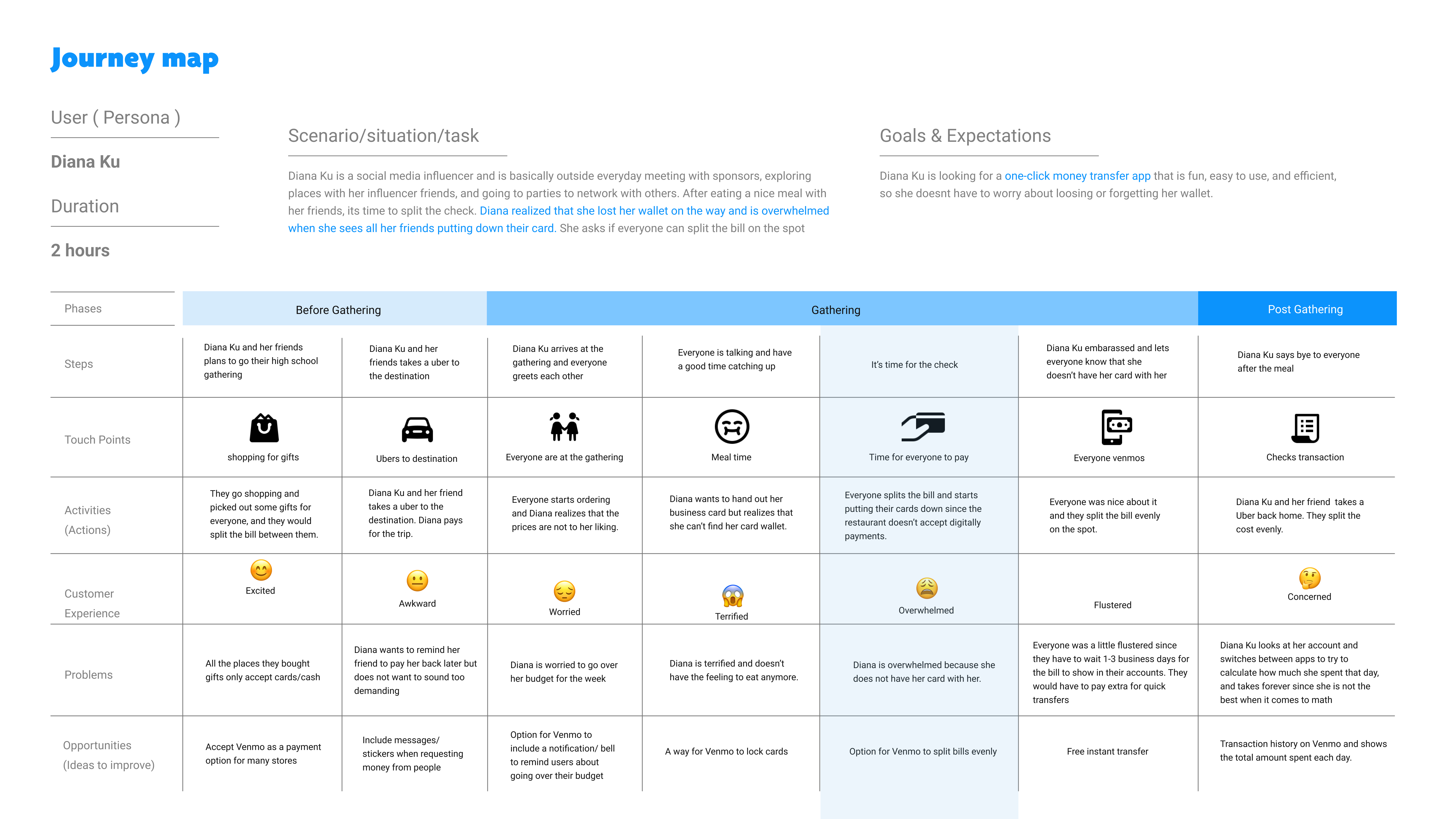 To begin our research we asked people around the city who were also regular users of not just Venmo but any money transaction app to further identify pain points, frustrations, needs, and desires with existing products to determine how Venmo could improve this experience. Our goal was to learn about the context of use, what they like, what they hate, and any feature they want in the want with a p2p app.