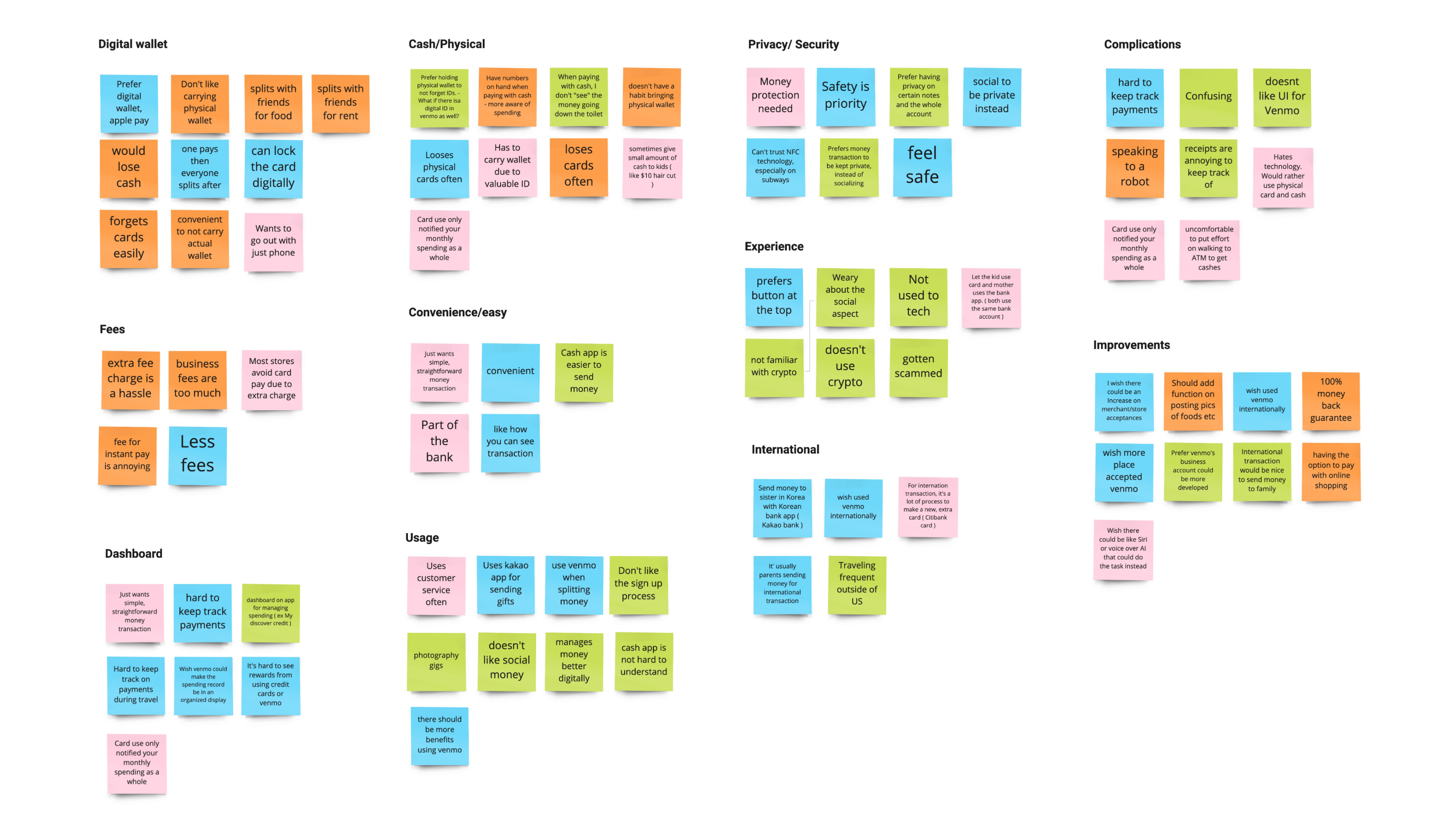 After conducting user interviews, all the participants responses were synthesized to identity themes, opportunities, and features that Venmo could focus and improve upon.